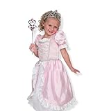 (More customer reviews)We purchased this for my daughter's 4th birthday and are very happy with it. This dress seems to be much better made than the more popular princess dresses available and even comes with the crown and sceptor. The crown and sceptor do not have jewels glued into them, but rather are painted in spots so it looks like there are jewels so you don't have to worry about them falling out and losing them or a younger one finding it and putting it in the mouth. They are very sturdy plastic and not very flimsy at all. Also, the dress itself is very soft and not scratchy. My daughter already wears a size 5 and the sizing is good as there seems to be room for growth and putting it on over other clothes right now. She has not been too into the princess stuff, but she absolutely loves this set! I have always been very happy with the quality of Melissa & Doug toys and this one is no exception!